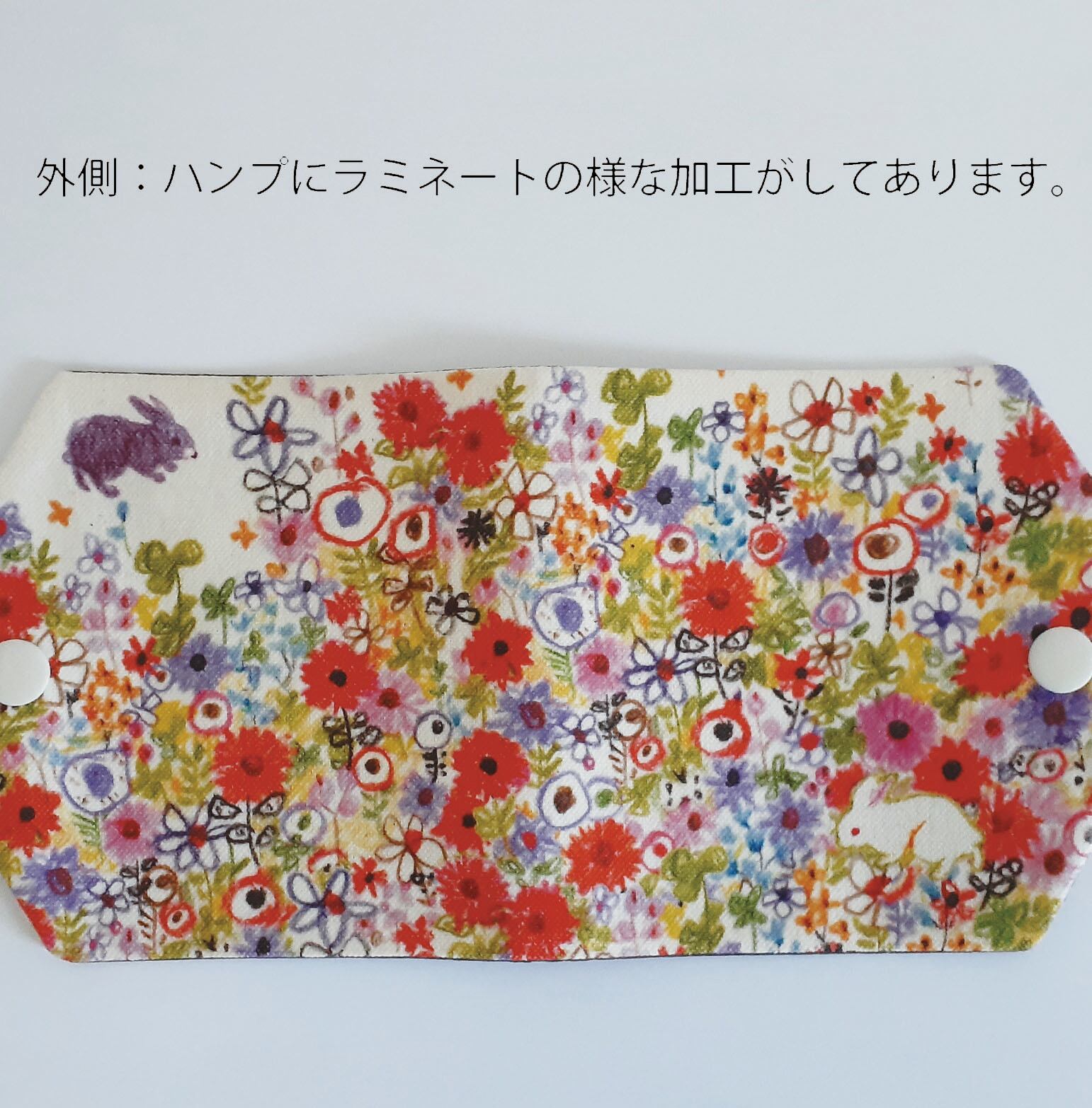 ハンドメイド サイズ:11.5×22.5cm 便利なスナップ付き 食事の時等、マスクをバックにそのままいれることなくマスクを保管するケースです。 外側:ハンプにラミネートの様な加工がしてあります。 中側:防水、撥水加工のナイロン生地です。 上記の生地ですので、アルコールスプレーや中性洗剤を染み込ませたタオル等で 軽く拭き取っていただくだけで除菌になるかと思います。